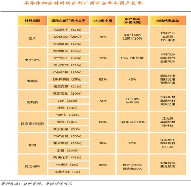 话不多说,给大家上一张图,应该大致就能够看出究竟来了,这是当前主要的芯片制造材料中,价值占比较高的产品,其前三大品牌(CR3)的占有率情况,以及国产化水平。